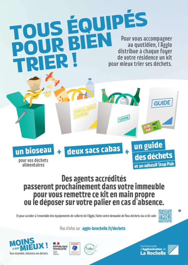 Jusqu’à l’été 2026, un kit déchets est distribué dans les immeubles pour aider chaque foyer à adopter les bons réflexes de tri au quotidien. Il est composé :