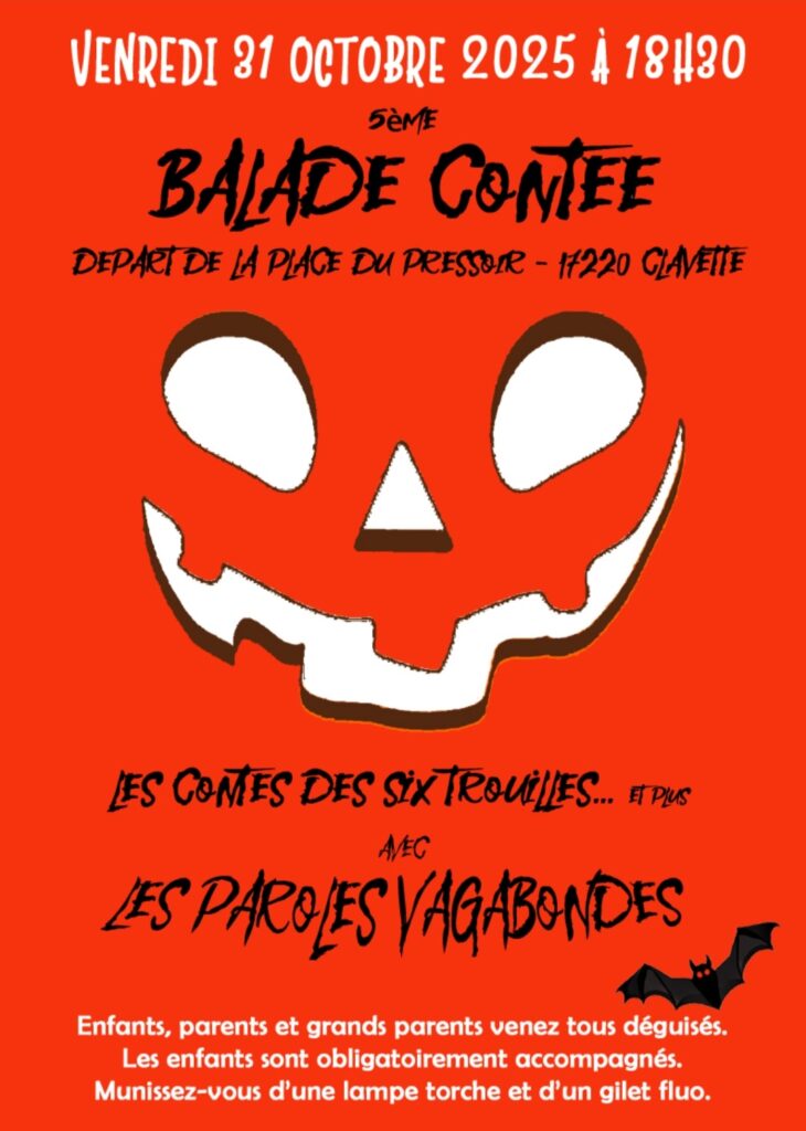 Pour fêter Halloween, la mairie et la bibliothèque de Clavette vous invitent à la balade contée des Six Trouilles avec « Les paroles vagabondes », Vendredi 31 octobre.