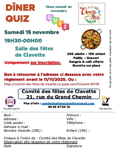 Le Comité des Fêtes de Clavette vous invite à partager un moment convivial lors de son Dîner-Quizz, le Samedi 15 novembre 2025